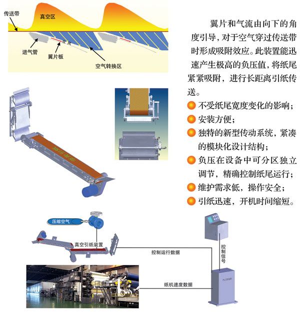 該設(shè)備是由于氣翼技術(shù)使傳送帶表面產(chǎn)生負(fù)壓,將運行中的紙尾緊緊吸附在傳送帶上。技術(shù)原理是傳送帶下方的翼片吹送壓縮空氣所產(chǎn)生的氣翼效應(yīng)。這種氣翼效應(yīng)可保證該引紙設(shè)備以少的空氣和能耗量產(chǎn)生極高的負(fù)壓值。